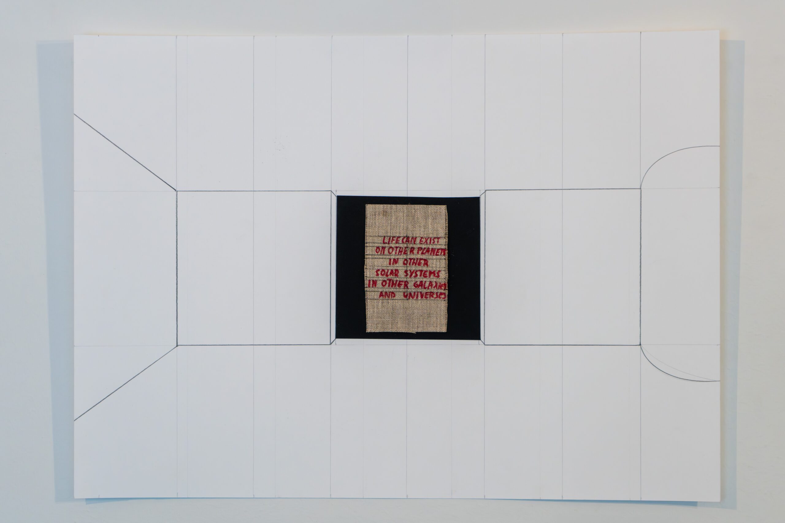 They Must Exist (2025); Inkjet print and pencil on paper, blue PVC; 42 x 59, 4cm